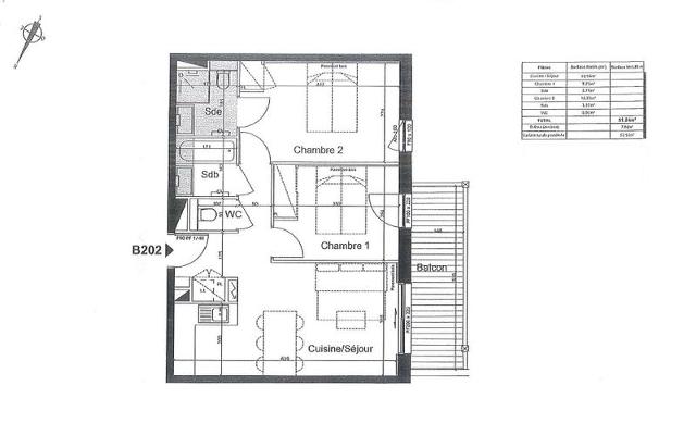 Entrance with a cupboard containing a washing machine, fully equipped kitchen opening onto the living room with dining area and direct access to the independent balcony, living room with a rapido sofa bed for 2, bedroom 1 with 2 beds 90X190 with direct access to the balcony, bathroom and separate wc.