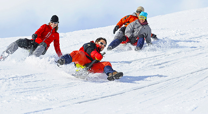 To get started, the technique is simple: sit on the seat and place your legs around the handle. Keep your feet on the snow to control your speed. For your first time, it’s best not to use the handle—keep your arms relaxed by your sides.