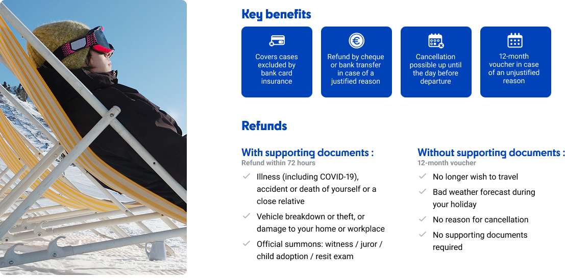 Travel with peace of mind! Get assistance and reimbursement for your expenses in case of unexpected events.