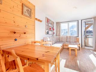 The spacious living room invites relaxation with its fireplace, flat-screen TV, and home cinema system. The dining area opens onto a modern, fully equipped kitchen (oven, microwave, fridge, dishwasher, professional Nespresso machine, etc.). From this light-filled living area, you step out onto two balconies with magnificent mountain views.