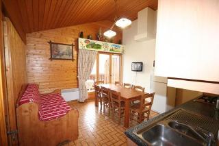 At the entrance, a mountain area with 2 bunk beds, a bedroom with a double bed 140 x 200 cm, a living room, a kitchen, a bathroom, a separate toilet, and a balcony exposed south-west .