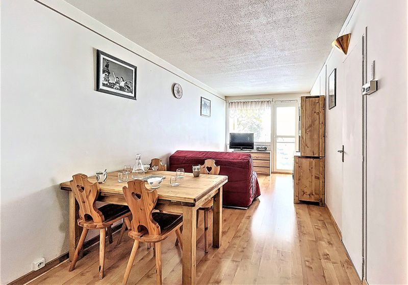 1-room studio 29 m2 on 4th floor, south facing position. Practical and beautiful furnishings: living/dining room with 1 double sofabed (140 cm, length 190 cm), TV (flat screen), DVD. Exit to the balcony. Alcove with curtain with 1 french bed (1 x 140 cm, length 190 cm). Small kitchen (2 hot plates, oven, refrigerator, toaster, water boiler, microwave, electric coffee machine, raclette grill, fondue Set (cheese)). Shower/WC. Parquet floors. Large balcony. Deck chairs (2). Very beautiful view of the mountains, the ski run and the resort. Facilities: iron, hair dryer. Internet (WiFi, extra). Please note: smoke alarm. FOR ARRIVAL BY BUS, please contact us 48 hours in advance to arrange key collection.