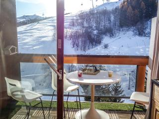 3-room apartment 46 m2 on 19th floor. Very beautiful and wooden furniture furnishings: living/dining room with TV (flat screen), hi-fi system and DVD. Exit to the balcony. 1 room with 1 pull-out bed (2 pers. 2 x 80 cm, length 190 cm). Exit to the balcony. 1 room with 1 french bed (140 cm, length 190 cm), hand-basin and separate WC. Exit to the balcony. Open kitchen (oven, dishwasher, 2 ceramic glass hob hotplates, refrigerator, toaster, water boiler, microwave, freezer, electric coffee machine, Capsules for coffee machine (Krups Nespresso), raclette grill, fondue Set (cheese)). Bath/WC. Electric heating. Parquet floors. 2 balconies 4 m2, balcony 5 m2. Deck chairs (2). Very beautiful panoramic view of the resort. Facilities: washing machine, hair dryer. Please note: non-smokers only. Smoke alarm.