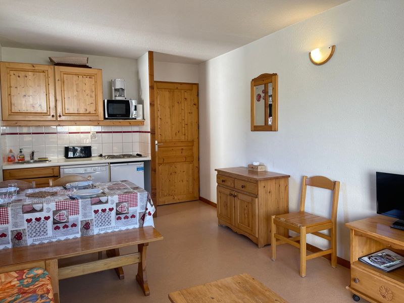45m² apartment with a 7m² balcony comprising: A living/dining room with a convertible sofa for 2 people and balcony access An equipped kitchen (fridge, combined microwave oven, dishwasher, filter coffee maker) A double bedroom A mountain corner at the entrance with 1 bunk bed and 1 pull-out bed (3 sleeping places in total) A bathroom with double sink and WC
