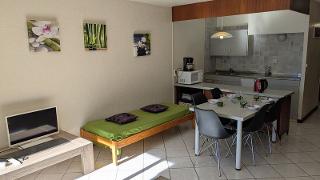 STUDIO 4 PERS 38M²~~ EXPO SUD - BALCON + JARDIN 1 2TAGE SANS ASCENSEUR Cuisine équipée avec micro onde, frigo top .... Séjour 1 BZ + 1 lit gigogne Salle d'eau : douche + WC Casier à skis