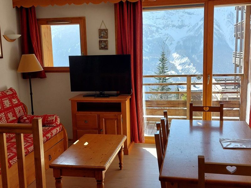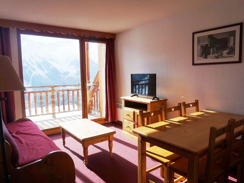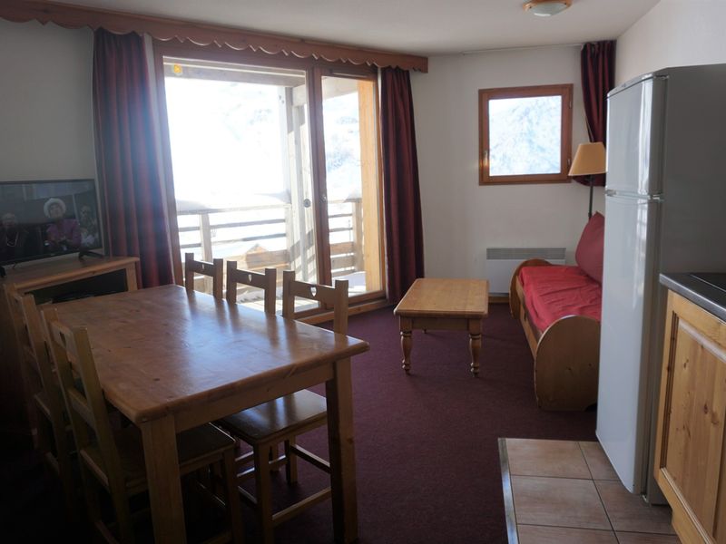 Living room: pull-out bed (2 single beds). TV Bedroom 1: 1 double bed Cabin: 1 bunk bed Kitchenette: ceramic hob; fridge/freezer; microwave; oven; dishwasher. Bathroom: bath. Separate WC. Covered parking space n°49 (level -1 facing the snow garden) included