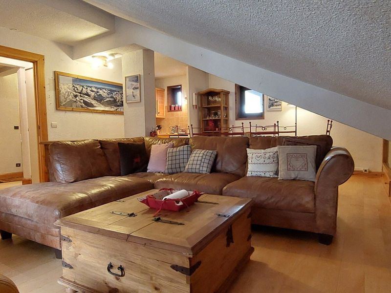 6-room duplex apartment of 120m2 (including 25m2 <1.80m) in a rustic chalet, accommodating up to 10 people. On the 2nd and top floor of the chalet with a south-facing balcony, featuring a beautiful volume under the roofs with exposed beams.
