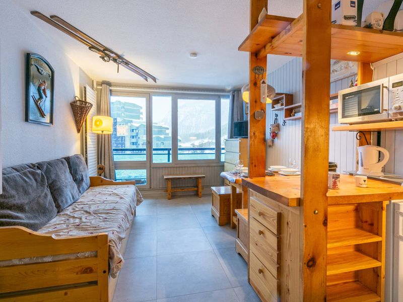 Studio in the La Daille area of 22m2 accommodating 4 people. Located on the 4th floor in block B of the residence with a south-facing balcony. Stunning panoramic view of the surrounding mountains. Ski locker no.18