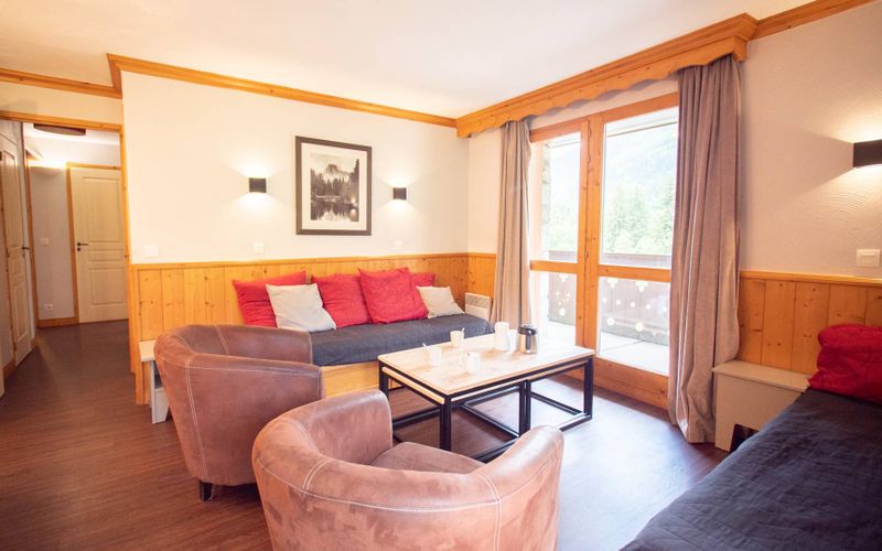 Entrance with open kitchen, a living room with a convertible double sofa bed, 140x190, a bedroom with two single beds 90x190. Bathroom with bath and toilet. Balcony North-east facing, offering a magnificent view of the mountains and Mont Blanc. Services included: End-of-stay cleaning (except kitchen), bed linen (except summer season*) * from June to September.